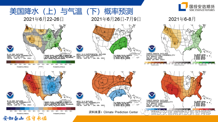 今春美国中西部地区天气干燥少雨、气温偏高,导致土壤墒情不佳,推升了市场担忧情绪及CBOT期货盘面的天气溢价。但根据NOAA多周期的天气预测和季度旱情展望来看,6-8月美国中西部地区的干旱范围和旱情不存在继续扩大和加重态势,市场不宜过度交易减产预期。预计6月下旬美国中西部地区有一轮降雨降温过程,7-8月降水趋势不明朗,没有明确的降水偏少趋势。虽然干旱威胁不大,但是需要警惕高温天气,在作物授粉期极端高温会影响授粉质量。
