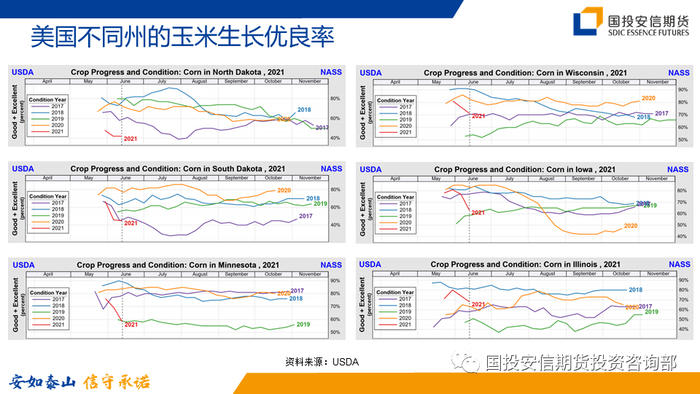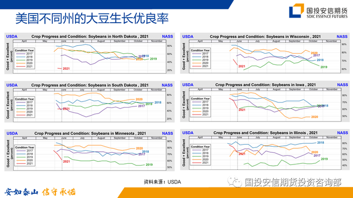 在美国玉米和大豆主产区即Midwest地区,严重干旱的比例并不高,存在干旱风险的州,按照干旱严重程度排序依次为北达科他州、南达科他州、明尼苏达州、爱荷华州、威斯康星州、内布拉斯加州。这些州的玉米和大豆生长优良率明显不及历年同期水平。