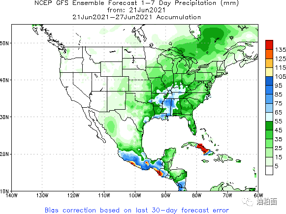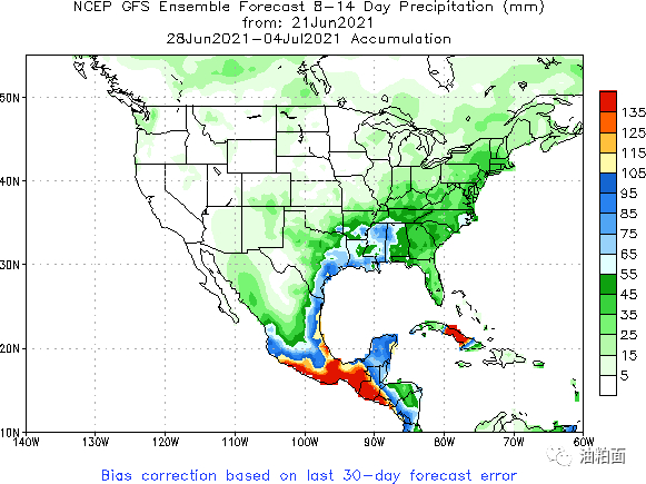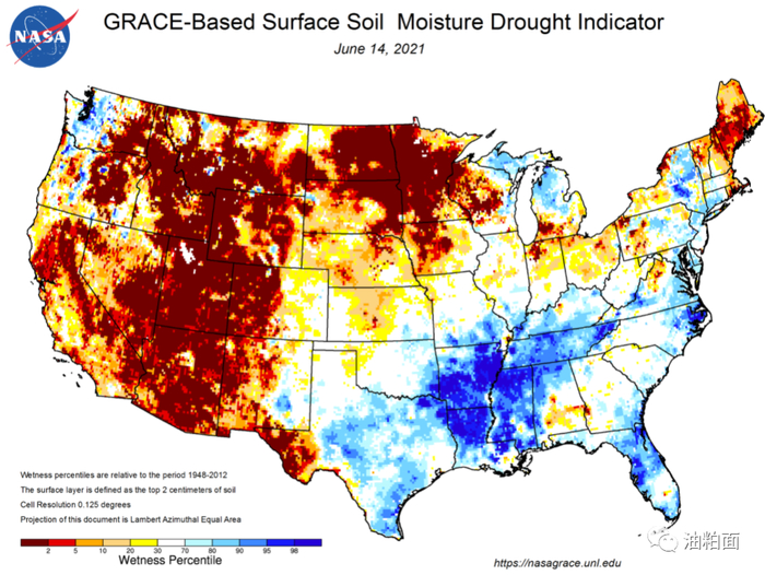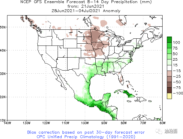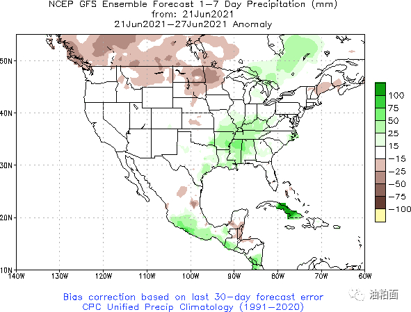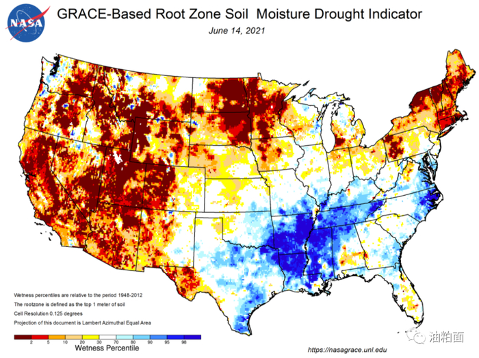 【主产区天气情况】在西部,一股创纪录的热浪正在减弱,尽管大部分地区的气温仍高于正常水平。事实上,相对正常的最热天气已经转移到太平洋西北部。此外,美国西部普遍存在干旱天气,加剧了干旱的影响。根据6月15日的美国干旱监测,83%的西部地区正在经历干旱(D1到D4),而11个州中49%的地区正在经历极端到异常干旱(D3到D4)。