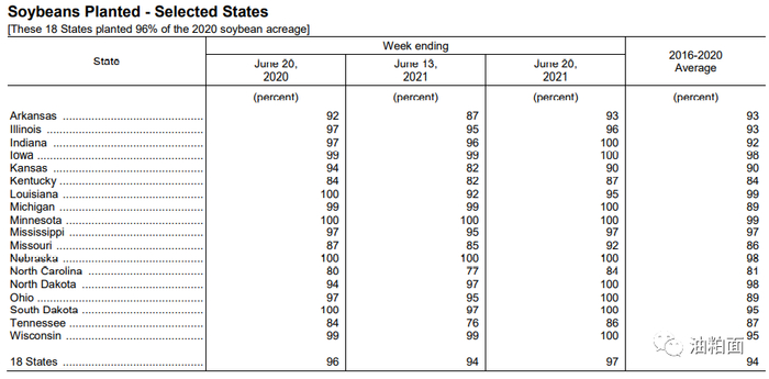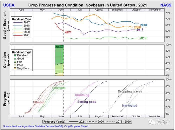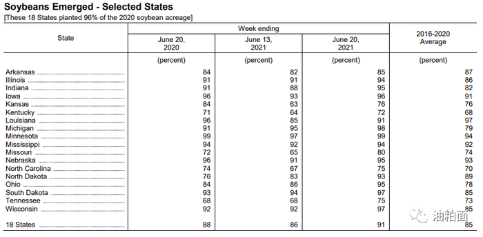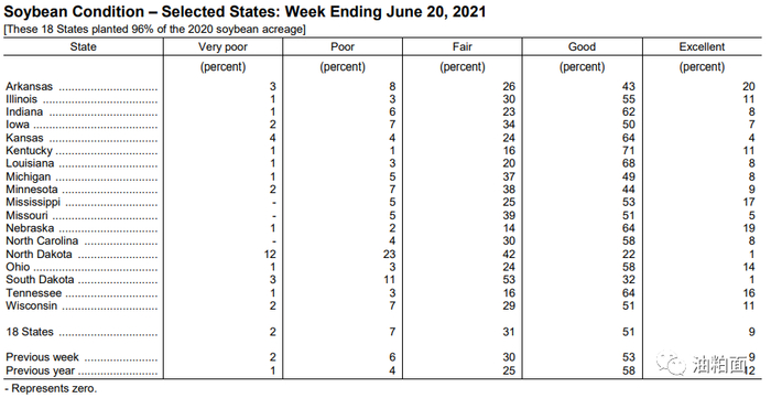 【作物生长状况】6月21日美国农业部(USDA)在每周作物生长报告中公布称,截至2021年6月20日当周,美国大豆优良率为60%,市场预估均值为60%,之前一周为62%,去年同期为70%;美国大豆种植率为97%,市场预期为97%,之前一周为94%,上年同期为96%,五年均值为94%;美国大豆出苗率为91%,之前一周为86%,去年同期为88%,五年均值为85%;美国大豆开花率为5%,上年同期为5%,五年均值为5%。