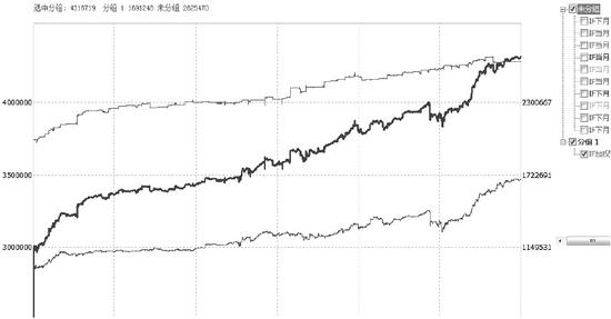 图5中横轴是时间,左侧数据是整个组合的资金数量,右侧数据是单个品种的资金数量。图中上部分曲线是上文网格套利的组合曲线,下部分曲线是上文中趋势追踪的资金曲线。