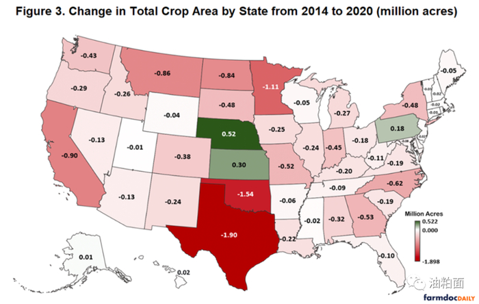 因此,下一个合乎逻辑的问题是,要问2014年之后总作物面积变化最大的地方。为了回答这个问题,我们收集了2014年和2020年作物总面积三个组成部分CRP和未种植的数据。