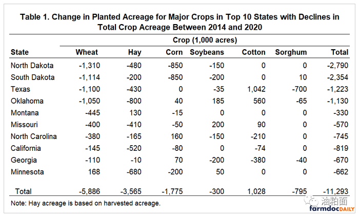 数据显示,小麦和干草的种植面积大幅减少,北达科他州、南达科他州、德克萨斯州和俄克拉荷马州的小麦种植面积减少了至少100万英亩。2014年至2020年间,只有明尼苏达州的小麦种植面积有所增加,不到20万英亩。