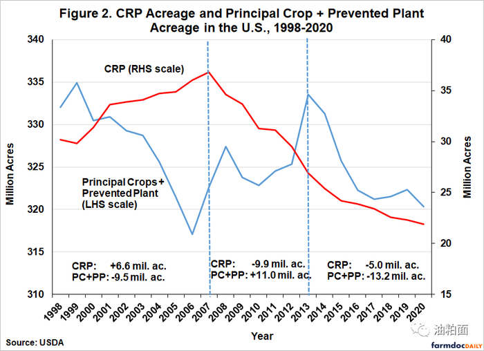 如图2所示,这大致是1998年至2007年期间发生的情况,当时CRP增加了660万,主要作物和撂荒面积的总和减少了950万。2007年到2013年,情况正好相反,CRP减少了990万,主要作物和未播种面积的总和增加了1100万。