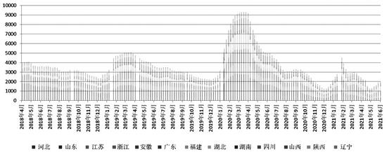 图为重点监测省份玻璃生产企业库存情况