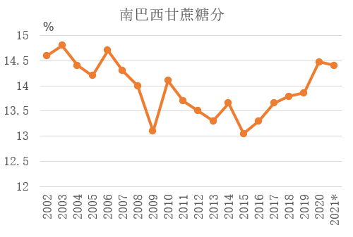 不过干旱有利于糖分积累,根据UNICA数据,2014/15榨季南巴西甘蔗糖分则高于前两个榨季,本榨季截至5月底甘蔗糖分为12.827%,同比增加0.158个百分点,而5月下半月数据体现得更明显,期间本榨季糖分为13.743%,达到历史高位,同比增加0.36个百分点。不过就历史数据看,2016/17榨季以来甘蔗糖分总体趋于上升,近两个榨季恢复至本世纪初水平附近,剔除天气因素影响,或也与甘蔗品种的变化有影响,如广西甘蔗品种的演变,就本榨季以来的甘蔗糖分变化并根据甘蔗植株生长状况(甘蔗健康程度不及上榨季)预测,本榨季累计糖分或略低于上榨季的14.47%,达到14.4%(属于市场预期上沿),则甘蔗产糖率接近13.7%,有助于缓解甘蔗单产下降带来的产糖量损失。