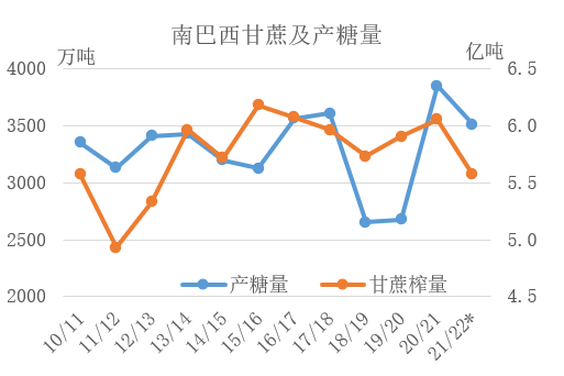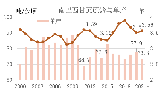 基于2021/22榨季与2014/15榨季甘蔗生长期间受旱情况相似,且甘蔗品性已与2011/12榨季差异大,同时2011/12榨季受旱后又经历霜冻和甘蔗开花,导致甘蔗单产下滑至68.7吨/公顷新低,不具可比性,以2014/15榨季作为基准,来评估本榨季的甘蔗受旱情况。2014/15榨季甘蔗的平均蔗龄为3.29年,单产为73.8吨/公顷,而去年的旱情出现早,影响宿根蔗翻种,本榨季甘蔗蔗龄较上榨季提高,预计为3.59年,蔗龄偏高导致甘蔗对天气灾害更加敏感,单产将不及2014/15榨季,不过近几年南巴西的耐旱甘蔗品种增加,有助于减轻单产下降风险。