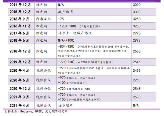 OPEC 减产会议一直是国际原油市场关注的重点,2021 年 3 月 4 日,沙特将自愿延长 100 万 桶/日的减产至 4 月,油价应声而起,重返疫情前高点。近期 4 月 OPEC+部长会议结束,虽然没 有达到市场此前最乐观的预期,但幅度有限且渐进的增产量显示出各成员国的态度释放供应仍 偏谨慎。而 4 月 28 日,OPEC+将再次举行会议,讨论当下对油价及供求的对策。本文将细数 OPEC 历次减产并探讨其对油价的影响。
