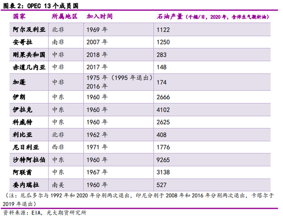 截至 2021 年,OPEC 共有 13 名成员国:阿尔及利亚、安哥拉、刚果共和国、赤道几内亚、 加蓬、伊朗、伊拉克、科威特、利比亚、尼日利亚、沙特阿拉伯、阿联酋和委内瑞拉。据 EIA 统计,2019 年 OPEC 加在一起的原油产量(包括伴生气凝析油)占全球总量的 38%,原油储备占 全球已探明原油储量的 71.8%。
