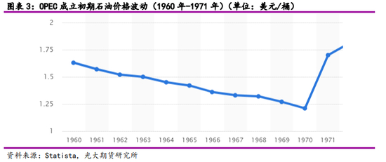 第一阶段,OPEC 成立起始,石油市场由“石油七姐妹”垄断转变为了两大组织之间的博 弈。由于 OPEC 相对比较弱小,对油价的影响有限,目标以从西方跨国石油公司手中夺回属于本 国的石油权益、争取石油定价权和实现石油工业国有化为主,此时全球油价保持在 2 美元/桶左 右的低位,尽管 OPEC 尝试通过减产等手段,以石油为武器达到自身的政治诉求,但是由于当时 全球石油供应相对过剩,其行动收效甚微。