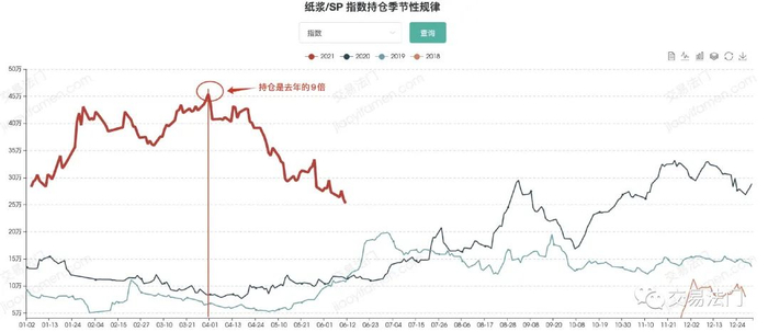 所以,盘面确实也像我想的那样,很快多头又增仓打回去了,价格继续创新高,空头被套的幅度更大了,然后多头一波流把价格拉到了7600多,创了近十年来的历史新高,空头可谓是惨败。一方面,价格是不断上涨的,创历史新高;另一方面,纸浆这个品种总持仓也创历史新高,去年同期不到10万手,今年同期已经超过45万手了,可见这些非标套利套进去的规模有多大。