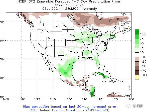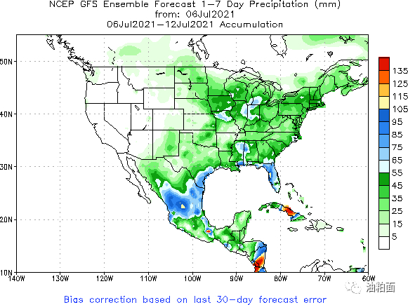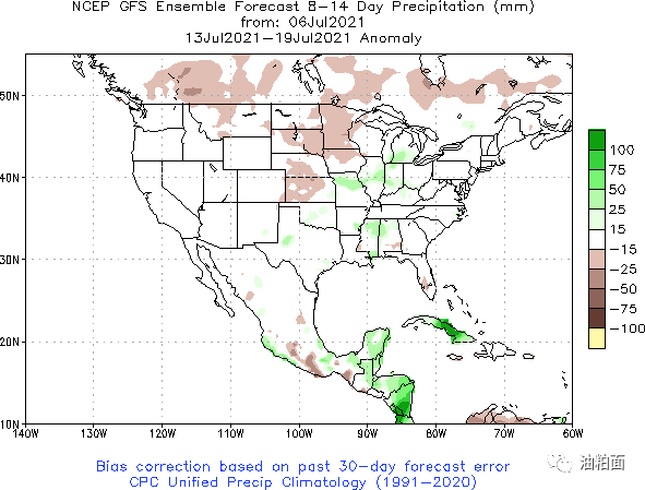 根据NOAA最新72小时累积降水图,中西部和平原大部分地区将在周三至周六期间至少得到一些可测量的水分。爱荷华州和威斯康星州可能是这段时间最大的受益地区,在接下来的三天里,每个州的大部分地区可能会看到1英寸左右。根据最新8日至14日的天气,7月13日至7月13日期间,北部和中部平原地区将持续季节性干燥天气,东部偏东地区较湿润的天气。