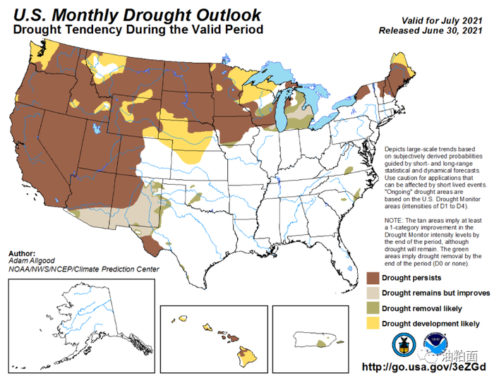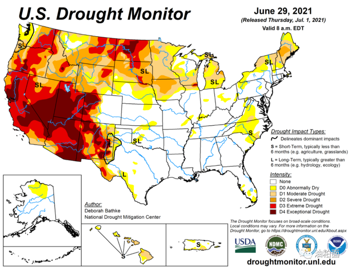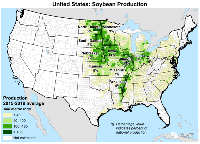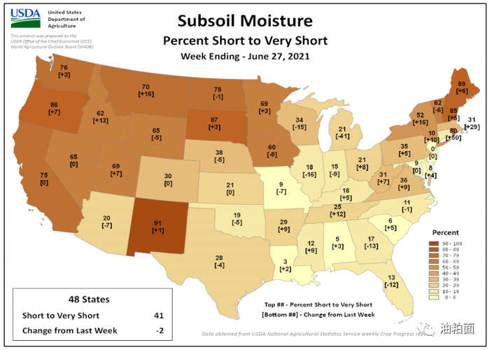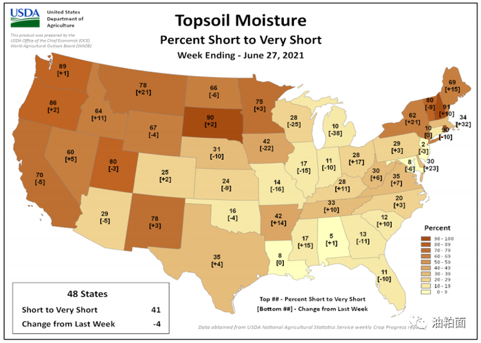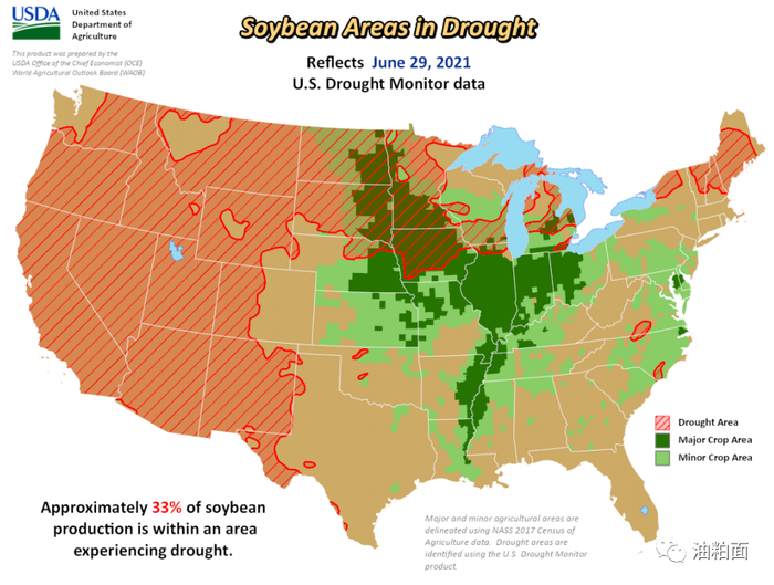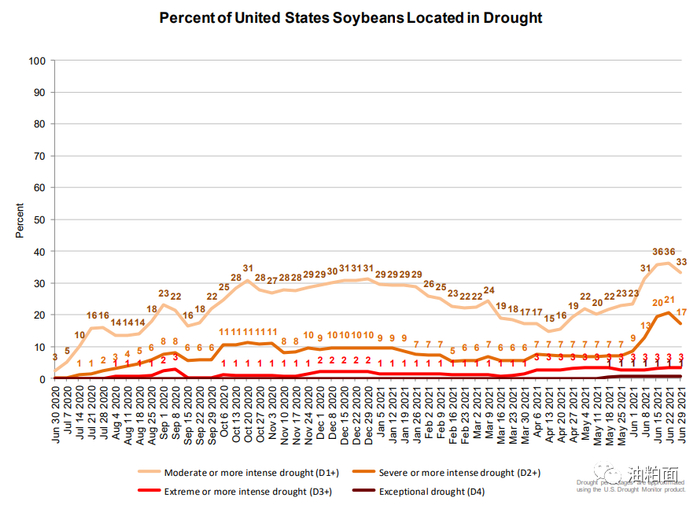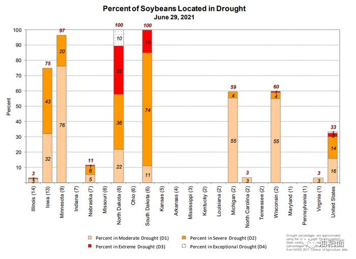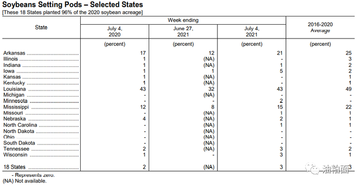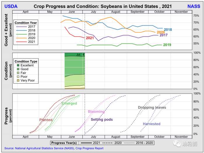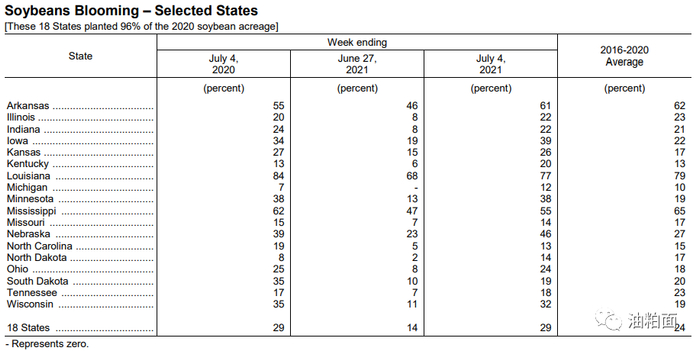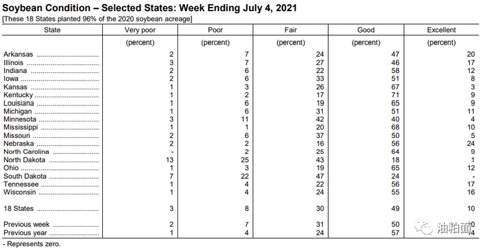【作物生长状况】美国农业部(USDA)在每周作物生长报告中公布称,截至2021年7月4日当周,美国大豆优良率为59%,市场预估均值为60%,之前一周为60%,去年同期为71%;美国大豆开花率为29%,之前一周为14%,上年同期为29%,五年均值为24%;美国大豆结荚率为3%,去年同期2%,五年均值3%。