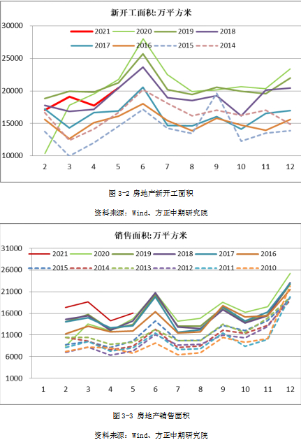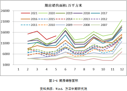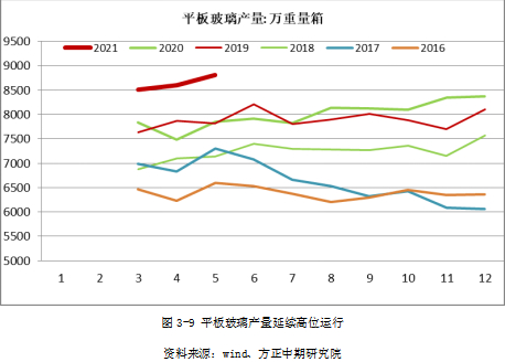 玻璃需求的最大驱动仍来自于房地产竣工端。据国家统计局,2021年1-5月期房销售面积累计58887.8万平方米,同比增加39.48%。尽管此数据有疫情期间的低基数效应,全年期房销售面积增幅仍不可低估。期房销售到完工交房常规周期在半年至一年,作为受合同约束的市场行为,房地产领域对竣工端大宗商品需求在下半年至明年上半年将维持刚性。