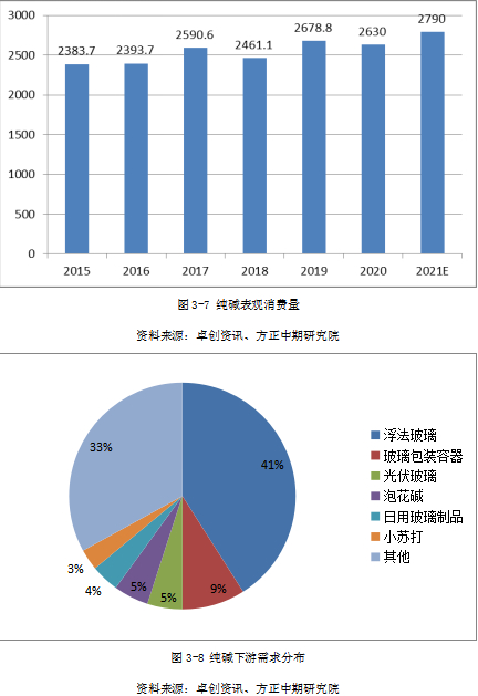 ◆2021年下半年纯碱需求预期强劲:2021年需求方面总的趋势是经济恢复性增长将带动纯碱需求的稳步回升。从下游行业分布看,纯碱广泛应用于工业生产及日常生活领域。2021年纯碱需求量有望恢复并超过2019年水平,预计为2790万吨。
