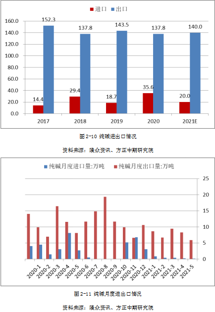 2021年1-5月国内纯碱累计进口量2.14万吨,同比降幅近90%;2021年1-5月累计出口量39万吨,同比降幅为26.6%。预计2021年随着国外经济活动的逐步恢复,我国纯碱对外出口量有望恢复到往年平均水平140万吨附近;由于国内价格处于相对低位,进口纯碱优势减弱,2021年进口量将同比有所回落,预计为20万吨或更低水平。