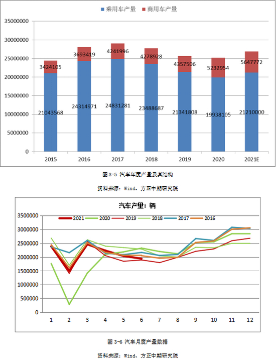 与三四线房地产市场的启动几乎同步,国内汽车产量于2016年增速下滑,并于2017年达到峰值2901.54万辆。分项来看,2015年至2019年乘用车产量分别为21043568辆、24314971辆、24831281辆、23488687辆、21341808辆;2020年乘用车产量继续下滑,我们从商用车2020年1-11月份累计产量22.39%的增幅可以看出,相比于疫情冲击,乘用车内在回落趋势对其影响更大。比较乐观的是,从1-11月数据看,2020年乘用车产量同比降幅8.09%,较前一年有明显放缓,较大可能成为其企稳回升的信号。