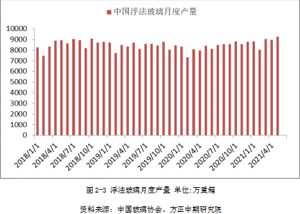 2021年1-5月,浮法玻璃累计产量44138万重箱,其中5月份产量9250万重箱,超过2018年10月9072万重箱,创出月度产量新的历史记录。尽管6月在产产能环比5月有一定增量,由于6月份比5月份少一个日历日,5月份的月度产量记录短期难被突破。
