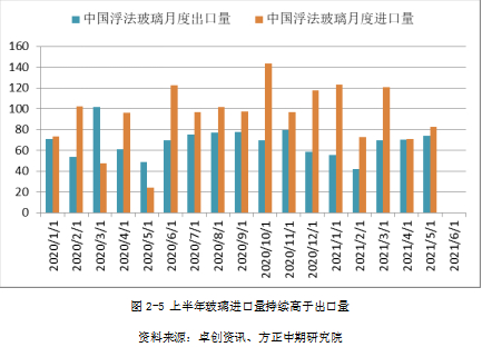 2021年1-5月,中国浮法玻璃进口量470.2万重量箱,同期出口量为312万重量箱,净进口158.2万重量箱。预计进口大于出口的趋势将在下半年继续延续,2021年中国大概率继续是玻璃的净进口国。国内价格将更多受国内供求关系调整,进出口对国内价格体系的影响力度将变小,国际价格受中国需求引领的态势将更加突出。