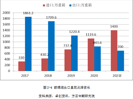 随着国内玻璃需求的旺盛,国内作为世界上最大的玻璃生产地和消费地,2020年历史性地从玻璃净出口国成为净进口国。