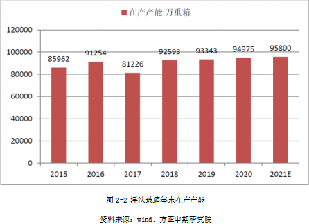 2020年是浮法玻璃装置产能置换新增投产大年,全年累计新增在产产能4829万重箱,投产时间主要集中在三四季度。预计2021年年末浮法玻璃总产能141500万重箱,稳定在全球产能的60%左右。