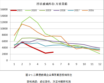 2021年上半年玻璃生产企业库存未能有效累积始终保持低位运行,成为玻璃价格攀升支撑力量的外在表征。5月末玻璃生产企业库存创出新低2293万重箱,仅略高于2020年年末水平。尽管6月份玻璃生产企业库存有所回升,从库存季节性变化的角度看下半年仍是去库周期,玻璃企业低库存状况使得库存去无可去,玻璃生产企业库存再创历史新低的可能性依然存在。