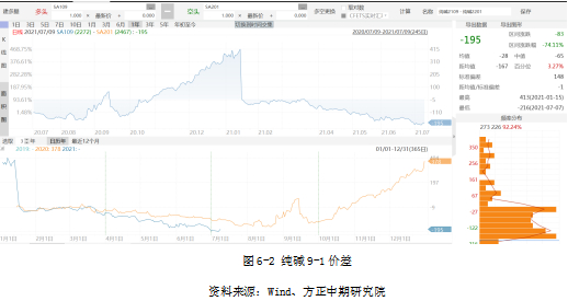 主力09合约受到7月合约临近交割影响,走势偏弱,9-1价差创出历史新低;9月合约进入交割月前会经历夏秋季的检修高峰,随着时间的推移,9月合约相对于1月会进一步走强。9-1正套符合纯碱装置开工率的季节性变化逻辑,配置有1月合约空头底仓有利于后期行情变化后的进一步操作,建议-200附近正套头寸积极参与。