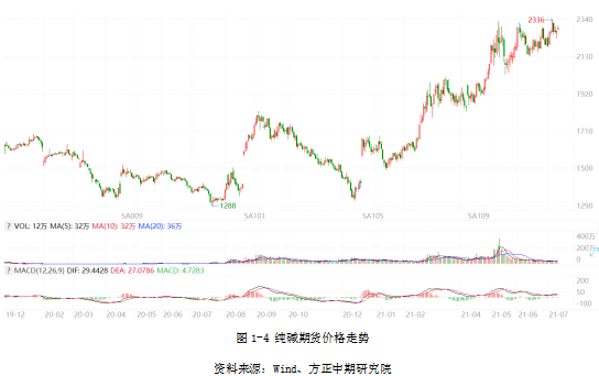 2021年上半年,做多热情在乐观预期影响下发酵,3月份纯碱价格攀升带动企业利润回升,进而带动纯碱装置开工率回升并创出新高,但纯碱库存的下降态势支撑盘面。纯碱期货主力合约于5月初拉升至2300元一线,此后维持了连续两个月的震荡,在压力位相对明确的同时支撑线不断上移。