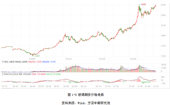 2021年上半年玻璃期货盘面保持升势,累计涨幅52.66%。春节前期货盘面从1800元/吨下方的绝对低位快速拉升,期货套保和现货备货行情共振,涨势延续至3月中旬。市场对中下游库存水平的担忧延缓了期货盘面涨势,震荡行情延续至4月初。随后市场对中下游经营状况的担心逐步得到修正,期货盘面持续攀升向现货靠拢并再度升水,体现了市场的房地产竣工需求预期。盘面于5月中旬创出历史新高2945元/吨,随后在大宗商品整体回调氛围中高位回落,但很快又在低位回补和逢低买盘的共同推动下走稳,7月上旬行情再度测试前高。