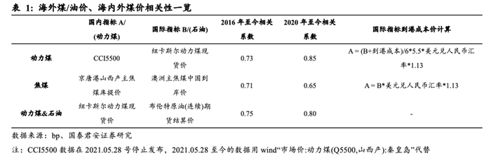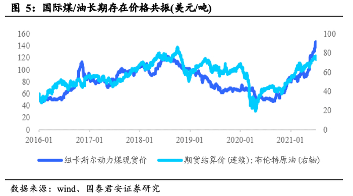 国内煤价与国际油价长期具有强相关性,油价上涨对煤价将有强支撑。2016至今国内煤价与国际油价的相关系数为0.75,2020年之后相关系数提升至0.80。煤炭和石油作为两大化石能源,从燃料角度,煤炭主要做发电、石油主要用作运输,其互相替代性相对较弱;但从原材料角度,二者均为全球重要的化工原材料,煤价和油价相关性提升也说明了全球复苏大背景之下,由于新能源难以快速放量,社会对于传统能源需求的一致性正在加强,鉴于国际油价的持续上涨,国际煤价、以及国内煤价也将具备强支撑。