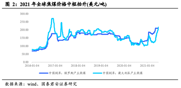 全球焦煤价格波动向上,中枢抬升。全球焦煤除中国外主要生产国为澳大利亚、俄罗斯,此两国主焦煤的中国到岸价对判断国际焦煤价格具有参考意义。2021年6月,澳洲主焦煤中国到岸价的均价为188.40美元/吨,俄罗斯主焦煤中国到岸价为210.19美元/吨,环比增长32.9%、3.3%,同比增长68.5%、78.1%。各国经济刺激之下,全球对于煤焦钢产业链的需求均有提升。不同于动力煤价格2021年以来持续上涨,焦煤价格2021年的波动性更大,主因为中国焦炭产量占全球75%以上,中国的焦煤市场是全球支配性市场,全球焦煤价格走势受国内2~3月焦煤下跌而波动。