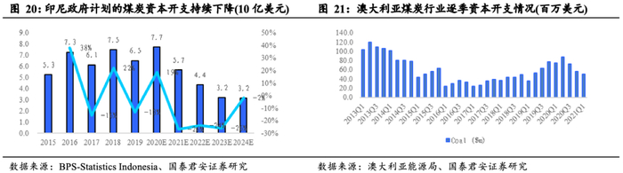 印尼、澳洲煤炭行业的资本开支均进入下行期。据BPS-Statistics Indonesia报告,印尼煤炭行业2020~2024年的目标资本开支分别为77、57、44、32、32亿美元,CAGR为-19.7%。据澳洲能源局数据,澳洲煤炭行业资本开支在2020Q2达到近5年高点的0.87亿美元后,在2021Q1降至0.51亿美元,资本开支也进入下行通道。
