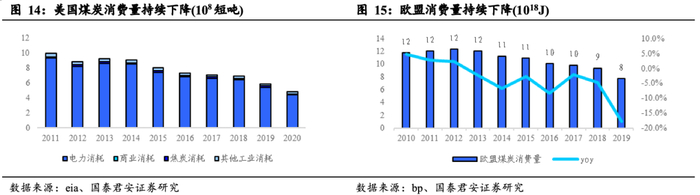 欧美地区煤炭消费量持续下降,是影响全球煤炭需求的另一边际变化。据EIA数据,2011~2020年间美国煤炭消费量由10.0亿短吨(1短吨 = 0.907吨)下降至4.8亿吨,CAGR为-7.8%;据bp数据,欧盟煤炭消费量由2010年的11.7艾焦下降至7.7艾焦,CAGR为-4.9%。