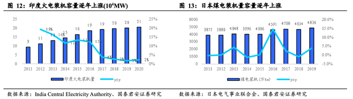 印度和日本的火电装机容量持续上升,是未来贡献全球煤炭消费的重要边际。由于中国的煤炭市场相对独立,中国发改委主要通过全球煤炭贸易来调整国内的供需结构,因此全球煤炭增长边际主要来自于亚洲的其它国家。据India Central Electricity Authority的报告,2011~2020年间印度火电装机量由90GW上涨到210GW,CAGR为9.9%,虽然2017年以来增速回落至低位,但总体保持增长。