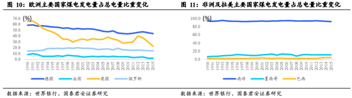 全球从煤电占比的角度看煤炭消费的变化,亚洲向上,欧美向下,其他第三世界国家整体趋稳。回溯1990~2015年世界银行的数据,亚洲主要经济体煤占发电量比重均保持向上或平稳,25年的区间中中国煤电占比下降0.7%、印度增加9.8%、印尼增加25.9%、日本增加19.7%;欧美国家煤电占比则出现不同程度的下降,区间中下降最大的为英国-42.2%、下降最小的为俄罗斯煤电占比基本持平;其他第三世界国家,包括南非、墨西哥、巴西等,其煤电占比分别变化-1.6%、4.2%、2.6%。