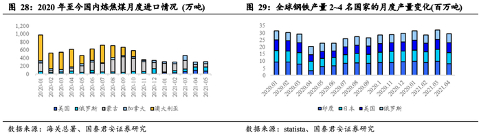 中国禁止澳洲焦煤进口之后暂未找到其它替代进口国,而全球层面主要钢铁生产国产量稳中向上,需求将支撑国际焦煤价格继续上涨。中国自2020年12月开始对澳洲焦煤零进口,且从月度数据可判断,停止澳洲进口后中国在积极的寻找其他焦煤进口替代国,增加了对加拿大、美国等国的焦煤进口并在2021年3月取得了积极地效果。但是之后的4、5月蒙古国受到疫情影响,进口规模再度大幅收缩,截至5月底其他国家的焦煤进口量还未完成对澳洲焦煤的替代。尽管中国对参与全球的焦煤贸易量下降,但是得益于除中国以外的全球钢铁产量2~4名国家产量稳中提升,国际主焦煤价格仍在需求支撑下持续上涨。