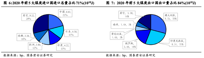 中国为全球最大的煤炭进口国,澳洲、印尼为全球主要的煤炭出口国。2020年全球煤炭进口集中在亚洲地区,尤其是东亚,其中中国进口6.61艾焦、日本进口4.56艾焦、印度进口4.22艾焦、南韩进口3.26艾焦,以上四国合计进口量占全球贸易量约60%。全球煤炭的出口更加集中,2020年澳洲、印尼、俄罗斯三国占据全球煤炭出国量约74%,其中澳洲出口9.25艾焦、印尼出口8.51艾焦、俄罗斯出口5.66艾焦。