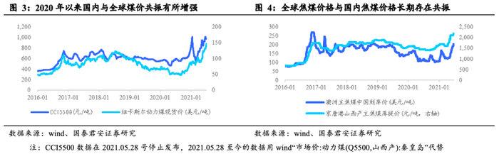 国际煤价与国内煤价2020年以来共振有所增强。我们用国际、国内同期煤价的相关性来衡量价格的共振情况,选用的指标分别为纽卡斯尔动力煤现货价、秦皇岛Q5500平仓价(CCI5500),2016至今的相关系数为0.73,而2020年至今相关系数提升至0.85,国内外煤价联动性明显提升。回看2016年以来的价格变化,2016H1国内与国际煤价走势高度一致,但2016H2~2020年国内煤价趋稳而国际煤价波动较大,我们认为主因是首先2016年中国发起的供给侧改革带动了全球煤价的上涨,但由于中国电价相对固定,为了平抑煤电间的矛盾,发改委2016下半年在对煤价的上涨进行了限制,并于2017年开始执行严格的长协煤政策,有效地控制了国内煤价的波动性。而2020年以后,伴随中国十三五期间供给侧改革的超预期完成,以及重大卫生事件导致国内煤炭生产、消费产生一定错配,国内煤炭市场与国际市场开启共振。