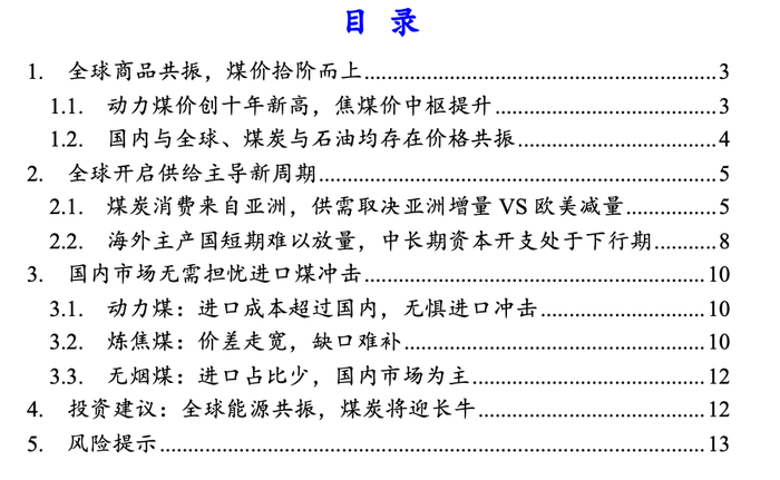 经济持续复苏,海外煤/油价、海内外煤价高度联动,价格连创新高,全球煤炭产能进入向下周期,供需缺口常在,无需担忧进口放开,看好行业长牛,焦煤、无烟煤更优。
