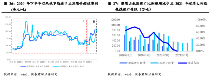 中国限制澳洲焦煤后,俄罗斯焦煤价格超过澳洲。回溯2016至今的俄罗斯、澳洲主焦煤中国到岸价数据,在2020H1之前,澳洲的焦煤价格多数时间是高于俄罗斯的,但在之后俄罗斯主焦煤价格开始反超,主因为2020下半年时中国开启了对澳洲进口煤的限制。数据显示,2021年前四个月我国炼焦煤净进口1478万吨同比下降44.7%。据煤炭资源网数据,2021年1~4月国内炼焦煤从澳大利亚零进口。