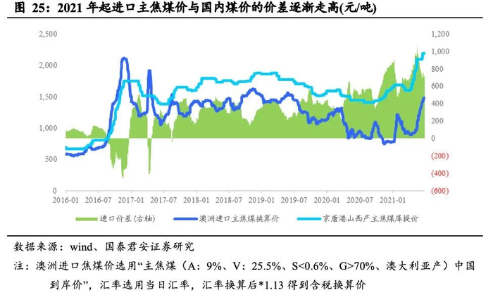国内主焦煤价格与国际价格的价差逐渐走高。截至2021年7月8日,京唐港山西产主焦7煤含税库提价为2300.0元/吨,而澳洲主焦煤中国到岸价为218.5美元/吨,考虑到汇率及增值税,澳洲主焦煤到港成本价为1600.2元/吨,与国内售价价差约700元/吨。自2020下半年国内焦煤市场逐步与澳洲焦煤脱钩以后,国内焦煤价格相较全球价格的价差持续扩大。