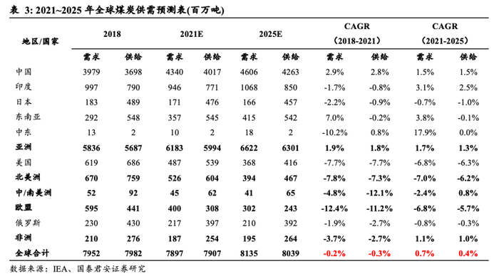 中长期看全球煤炭市场将持续需求增速大于供给,且剪刀差逐步扩大。据国际能源署(IEA)和我们统计的数据测算,2018~2021年全球煤炭需求的CAGR为-0.2%、供给为-0.3%,全球煤炭市场的供需形式正发生着逆转,且在此区间内亚洲国家的需求增速(+1.9%)率高于供给(+1.8%),北美、欧盟的需求(分别-7.8%、-12.4%)收缩速度略大于供给(分别-7.3%、-11.2%),由于亚洲庞大的绝对需求量,全球需求增速略高于供给。展望2025年,全球需求与供给增速的剪刀差开始扩大,经测算2021~2025年全球煤炭需求的CAGR为0.7%、供给为0.4%,主因是预计亚洲地区的需求增量大于欧美的需求收缩量。