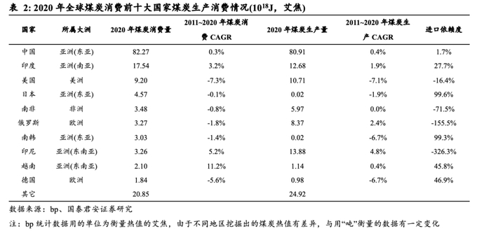 全球煤炭消费主要来自亚洲地区,煤炭生产则主要来自环太平洋地区。据《BP世界能源统计年鉴(2021年版)》,2020年全球煤炭消费合计151.42艾焦(=1018J,1艾焦可换算为0.43亿吨热值为Q5500的煤),其中中国消费82.27艾焦占比54.3%、印度消费17.54艾焦占比11.6%、美国消费9.20艾焦占比6.1%。且回溯2011~2020年数据,中国煤炭消费CAGR为0.3%、印度为3.2%,同期美国则为负增长CAGR-7.3%,全球煤炭消费增长主要由亚洲两国引领。2020年全球煤炭生产国集中在亚太地区,分别为中国(80.91艾焦,占比50.7%)、印尼(13.88艾焦,8.7%)、美国(10.71艾焦,6.7%)、澳洲(12.42艾焦,7.8%)、印度(12.68艾焦,7.9%),以上五国占全球煤炭产量81.8%。2011~2020年期间,除了美国产量负增长以外(CAGR为-7.1%),中国(0.4%)、印尼(4.8%)、澳洲(1.9%)、印度(1.9%)均保持增长。