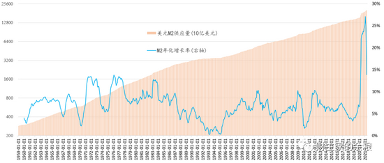 拿最近20年来说,2001年的911事件,2008年的全球金融危机和2020年的疫情危机,都让美国的M2增长率出现飙升,尤其是2020年的新冠疫情危机之后。