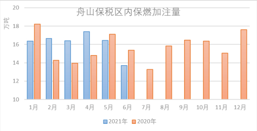 2021年1-6月份,舟山每月的加注量在30-40万吨,主要以低硫加注为主,其中舟山保税区内加注量为96.85万吨,同比增长3.4%。舟山具有加注牌照的企业共有16家,其中在经营的企业有中石化舟山、中船燃,中石油燃料油、海港国贸,浙石油海洋、中油泰富、中石化中海、远投油品、信力石油、中长燃和中石油上海11家企业。中石化舟山加注最多,占舟山加注总量的30%,中船燃其次占23%,中石油燃料油占12%,非“中”字头的海港国贸和浙石油海洋分别占10%和9%。总体船燃加注体量稳中有进,但增长压力较大。