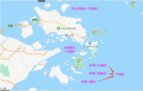 2、 舟山外锚地:虾峙门锚地、条帚门锚地、秀山东锚地;