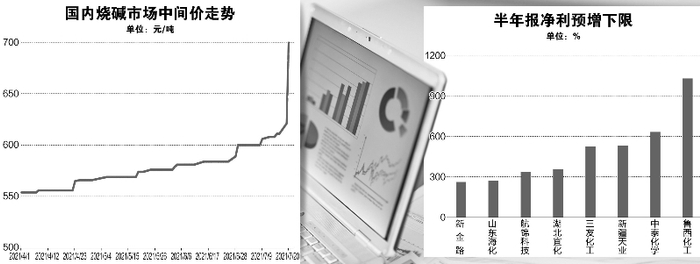 今年上半年,不少烧碱类上市公司业绩预喜。在已公布业绩预告的烧碱概念股中,超九成净利润预计翻倍增长,包括鲁西化工、中泰化学、新疆天业、三友化工、江山股份等。鲁西化工净利润预增幅度最高,公司预计上半年净利润为25.5亿元至26.5亿元,同比增长10.28倍至10.72倍,中泰化学、新疆天业、三友化工等个股业绩预增下限均超过5倍。