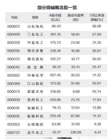 7月以来烧碱概念股二级市场表现同样不俗,山东海化、三友化工、中盐化工、鄂尔多斯、湖北宜化等5股涨幅超过30%,新金路、中泰化学、江山股份、新疆天业等涨幅超20%。