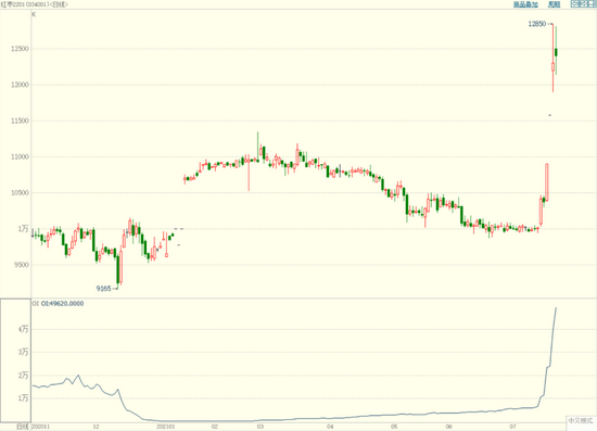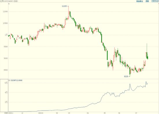 7月14日,新疆产区传出因高温天气影响,出现落果现象,或对产量带来不利影响,红期货新季合约率先起势,如CJ2201合约在随后的几个交易日里连续三个交易日涨停,以7月14日最低价至7月20日最高价计算,5个交易日连续拉涨2815点,上涨幅度之大,速度之快,让人叹为观止。在新季合约的带动下,近月主力合约亦大幅上涨,重回9000元/吨上方,最高涨至9640元/吨。