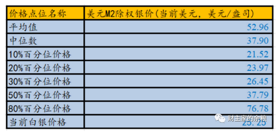 布雷顿森林体系的崩溃,让人类进入到纯粹的信用货币时代,在这个时代里,信用货币总量对于一切资产的价格都影响极大,更不必说带有贵金属光环的白银——如果从附带货币属性的角度来评估白银价格所处的水平,美元M2除权银价,是个相对靠谱的指标。所以,我也列出这642个月美元M2除权银价的平均值、中位数及不同百分位的价格。